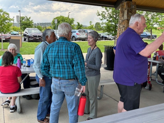 Gary Fentiman (back of head), Karen Kauffman Fentiman talking to Gwen Lapp Lien.